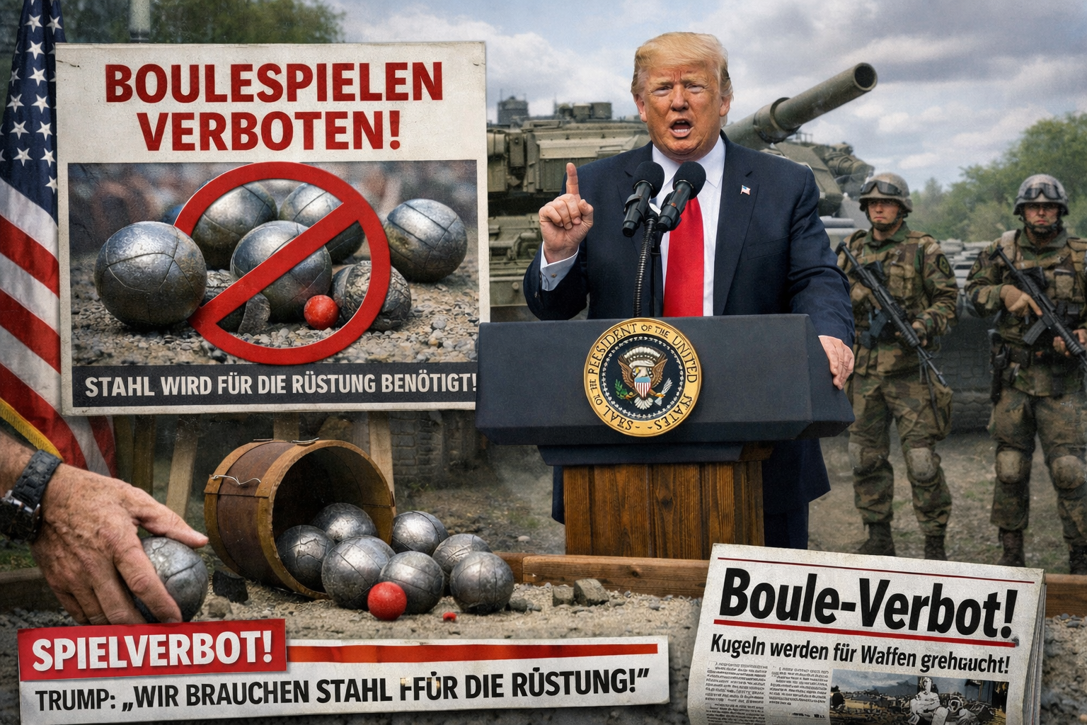 WASHINGTON/BERLIN/BUDAPEST/MOSKAU – In einer überraschenden und von Beobachtern zunächst ungläubig aufgenommenen Ankündigung hat der amtierende US-Präsident Donald Trump laut einem satirischen Bericht gefordert, das Boulespielen international zu verbieten. Begründet wurde der Vorstoß angeblich mit geopolitischen und militärstrategischen Überlegungen.